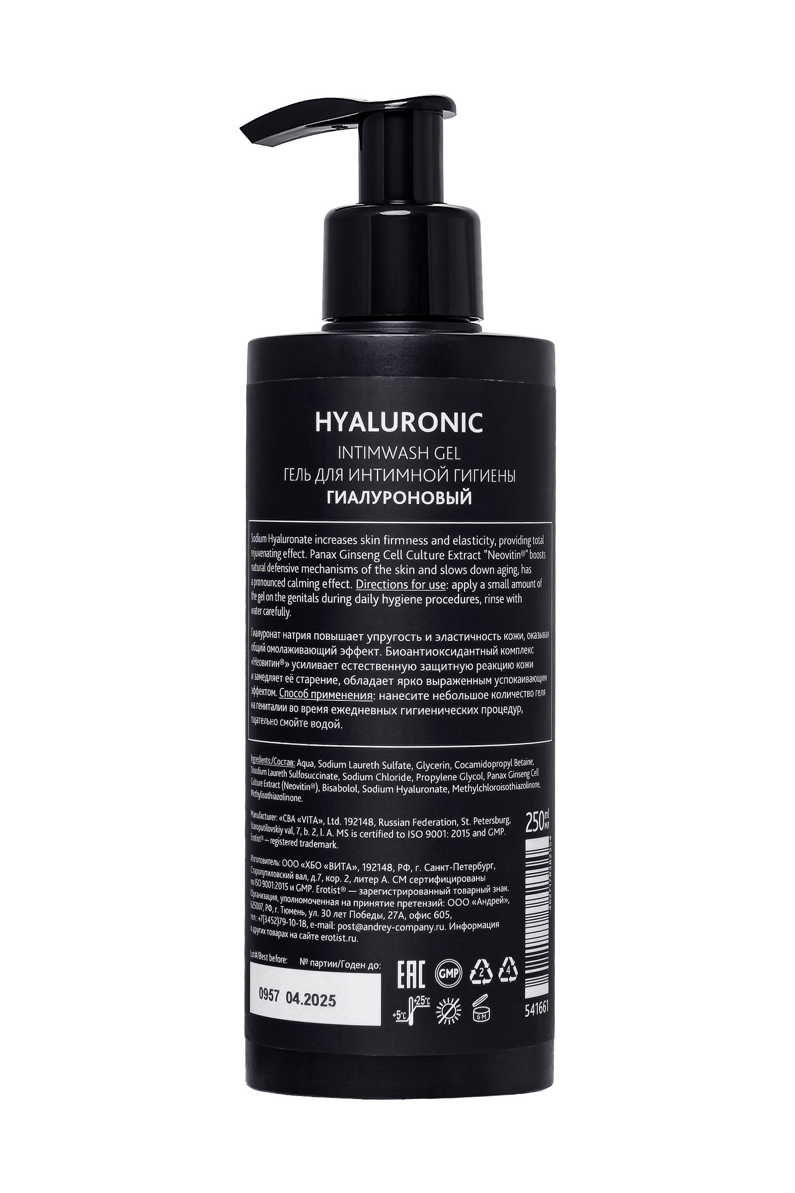 Hyaluronik asit içeren samimi hijyen jeli, vücudun sadece görünen kısımlarının değil, cildin durumuna dikkat çekmek isteyen kişilere günlük kullanım için uygundur. Sodyum hiyalüronat cildin sıkılığını ve elastikiyetini arttırır ve genel olarak gençleştirici bir etkiye sahiptir. Biyoantioksidan kompleksi "Neovitin"® Cildin doğal koruyucu reaksiyonunu güçlendirir ve yaşlanmayı yavaşlatır, belirgin bir yatıştırıcı etkiye sahiptir.